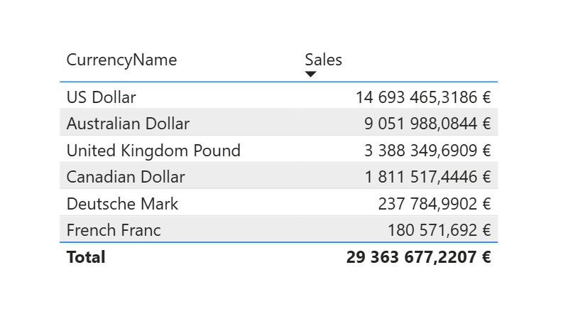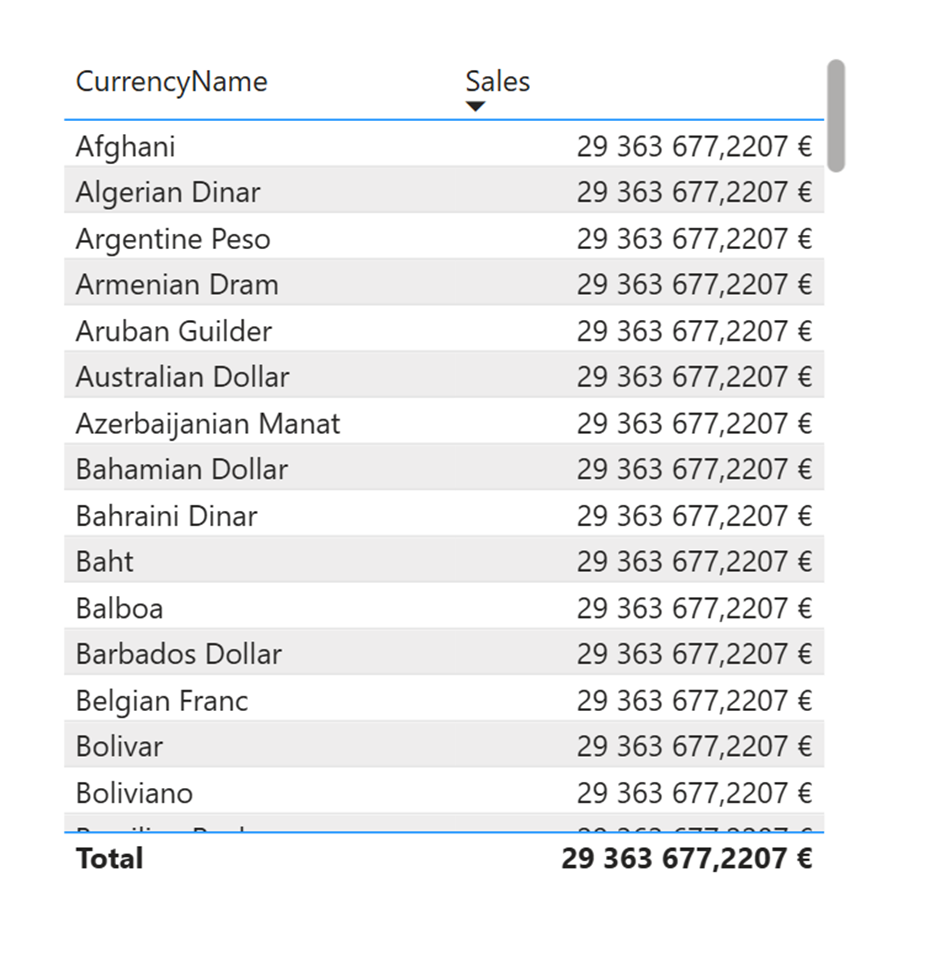 The Sales department has created a report intended to display sales by currency name. However, the report is not showing sales correctly.
