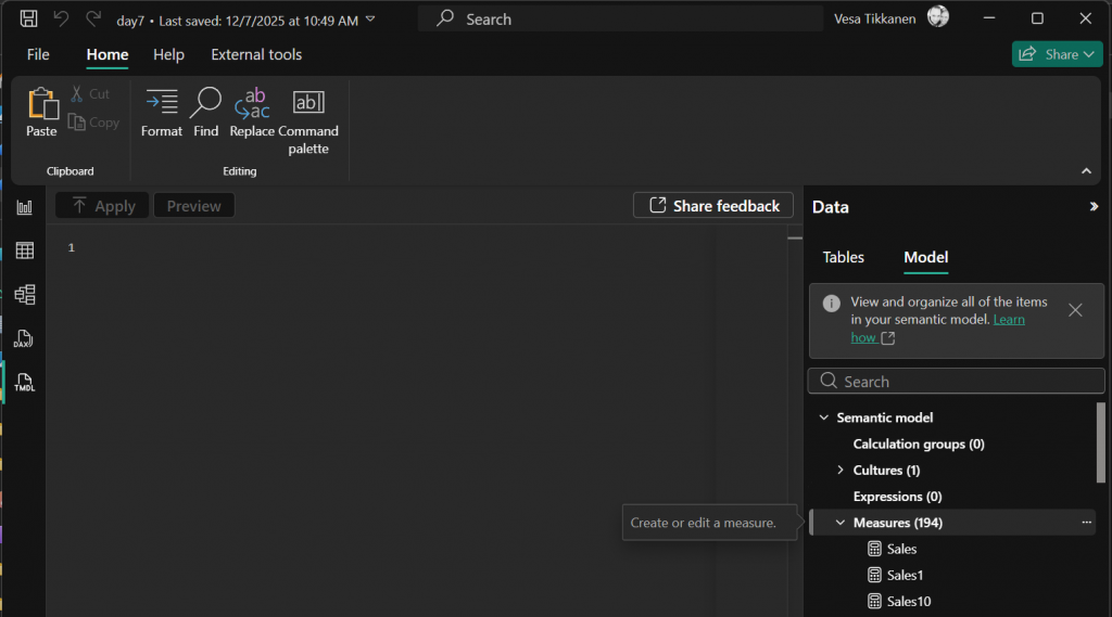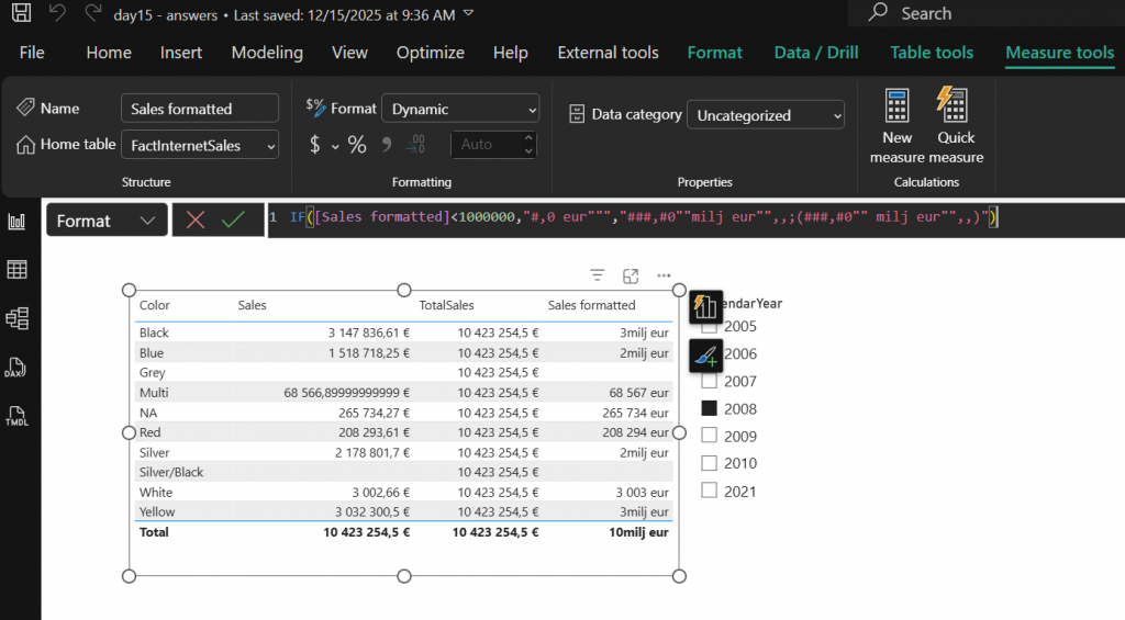 Vastauksia tuli 4 kpl. Yhdessä vastauksessa kritisoitiin termistöä, joka oli itseasiassa ihan oikein! Juoksin tehtävän liian nopeasti, enkä käyttänyt oikeaa termiä “Tasaerä”.. Eli jokainen payment olisi saman kokoinen, sen takia vastauksia tuli pari erilaista, enkä voi sanoa kummankaan olevan väärin. Tavoitteenani oli käyttää termiä “tasaerä”, jolloin jokainen kk-maksu on aina yhtä iso. Ja oikeastaan tarkoituksena oli avata sitä että DAX:ssa on tosi paljon funktioita valmiina. Sellainen funktiolistan läpikäynti: DAX function reference – DAX | Microsoft Docs aina välillä olisi oikeasti ihan hyödyllistä ajankäyttöä!